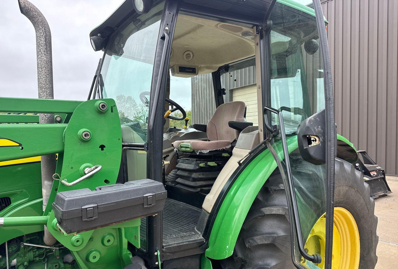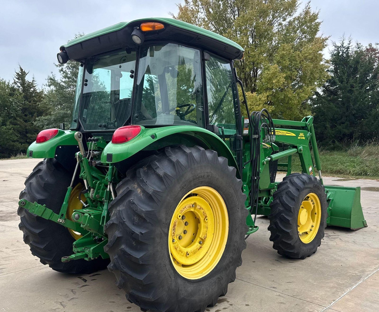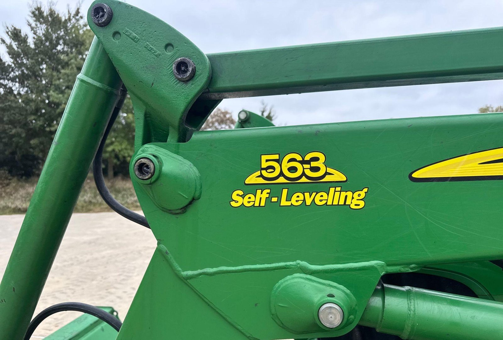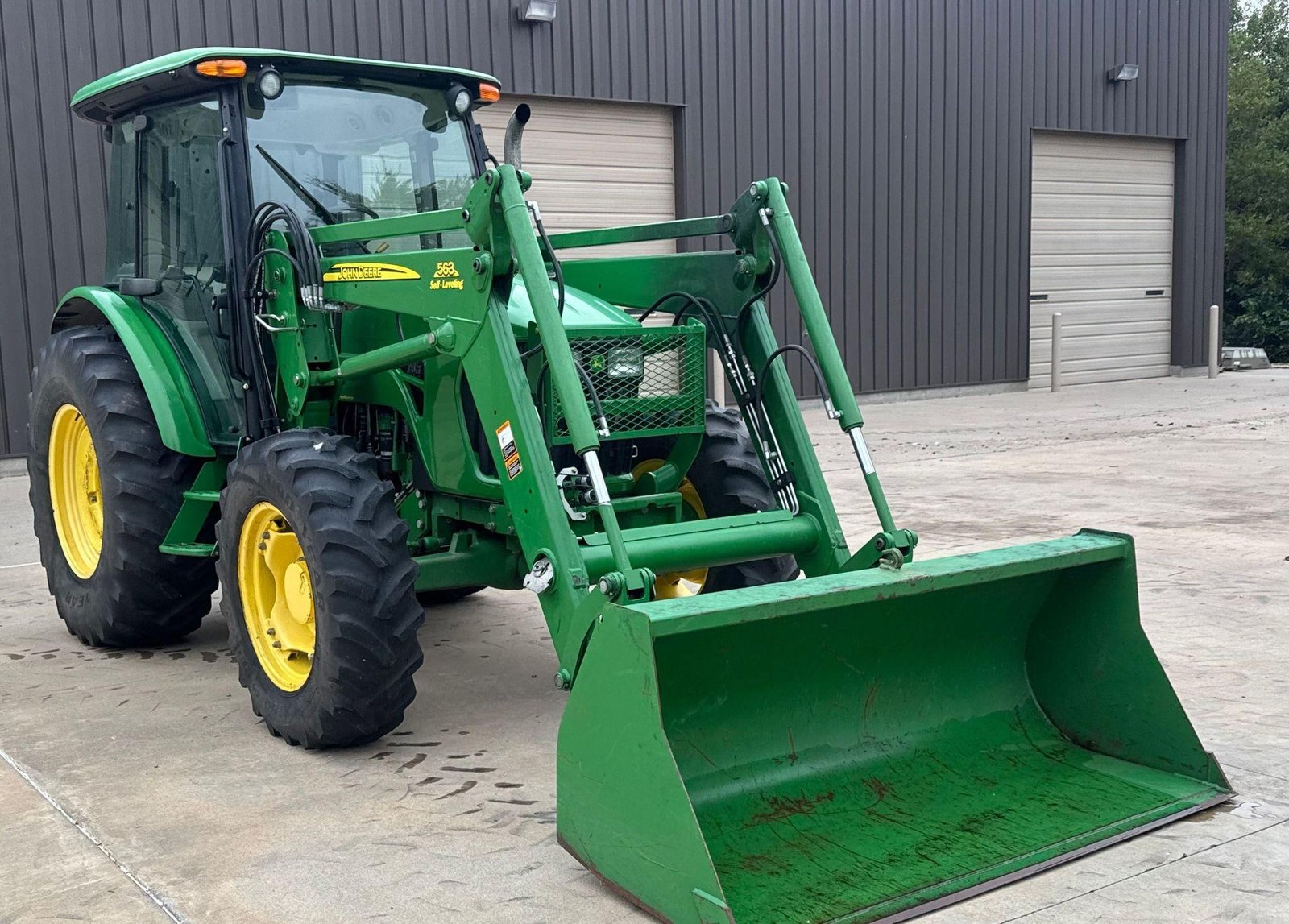 Fitted with a John Deere 563 loader featuring joystick controls and 75″ bucket. Clean, strong tractor ready for field or loader work.