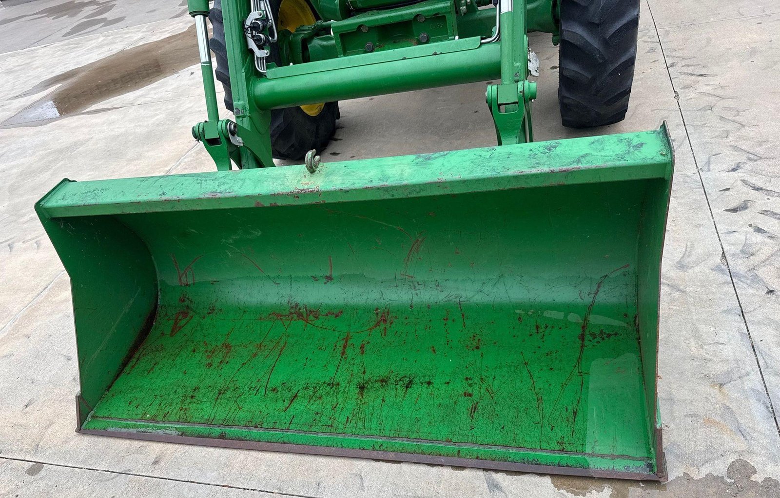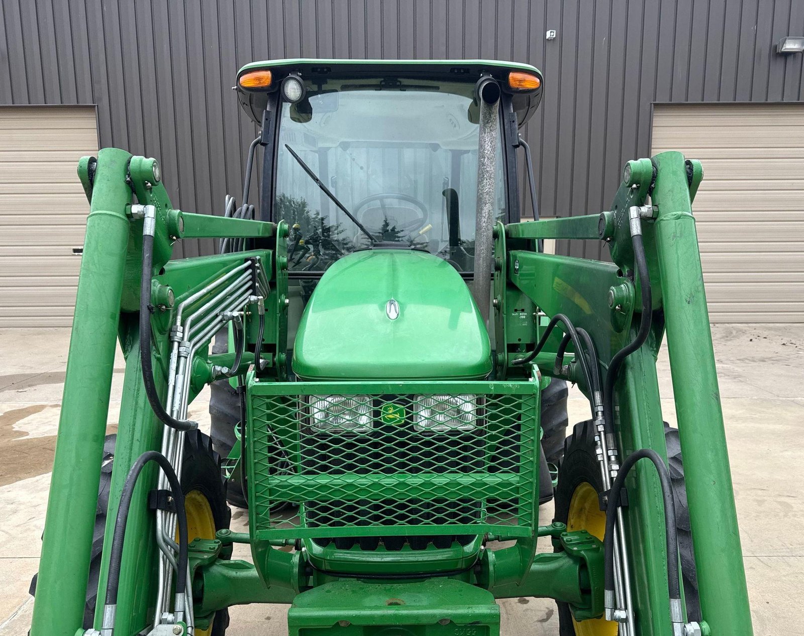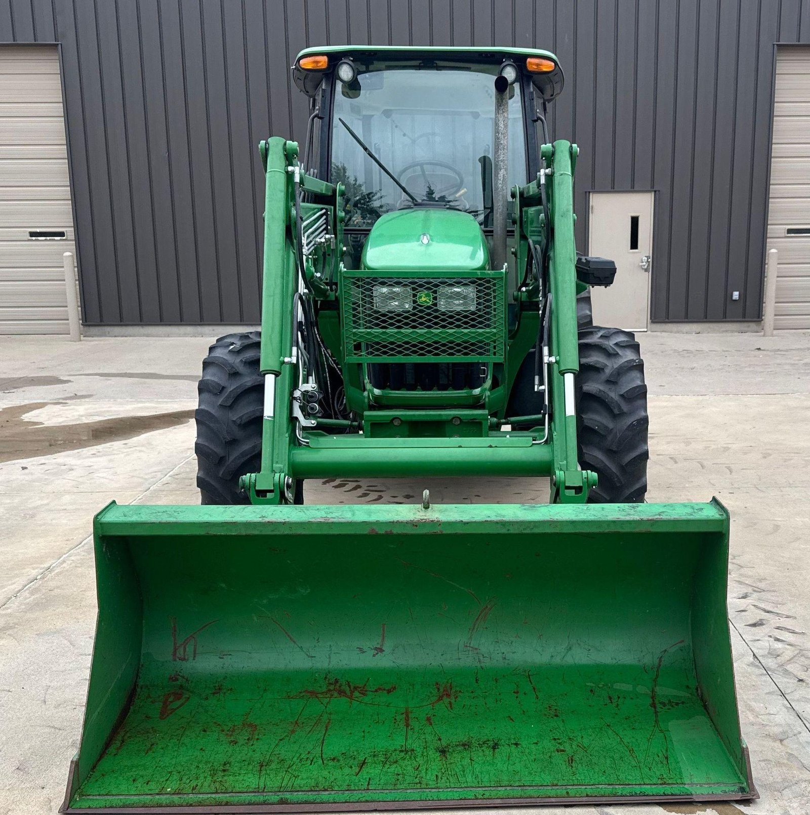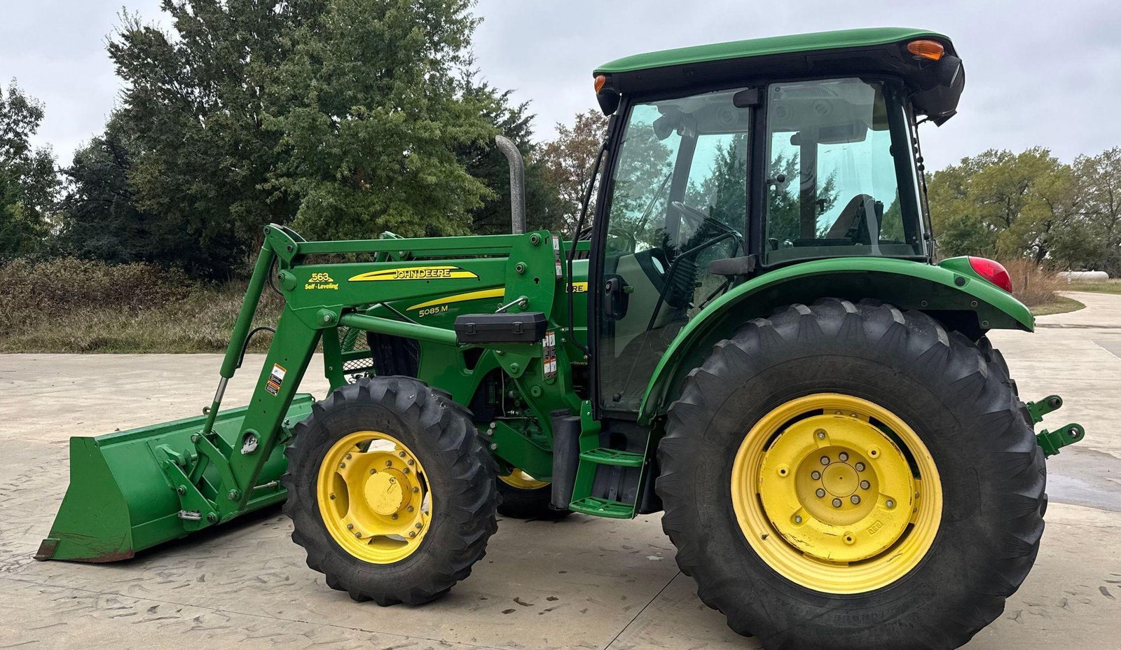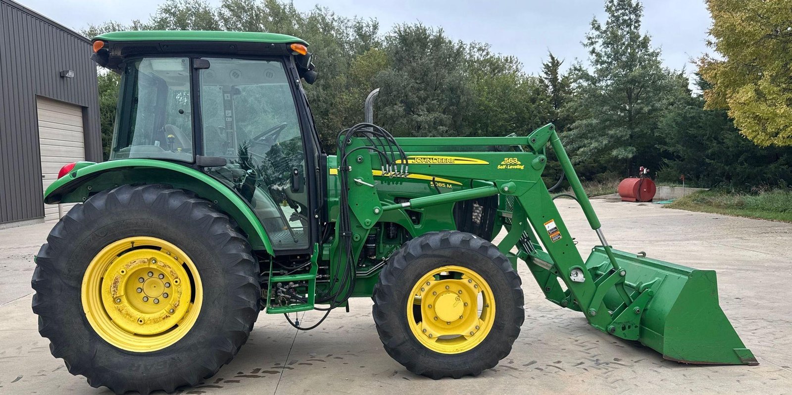 Fitted with a John Deere 563 loader featuring joystick controls and 75″ bucket. Clean, strong tractor ready for field or loader work.